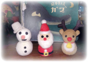 店内に並ぶ絵本のキャラクターのフェルトマスコットは、マスター安達さんの作品。